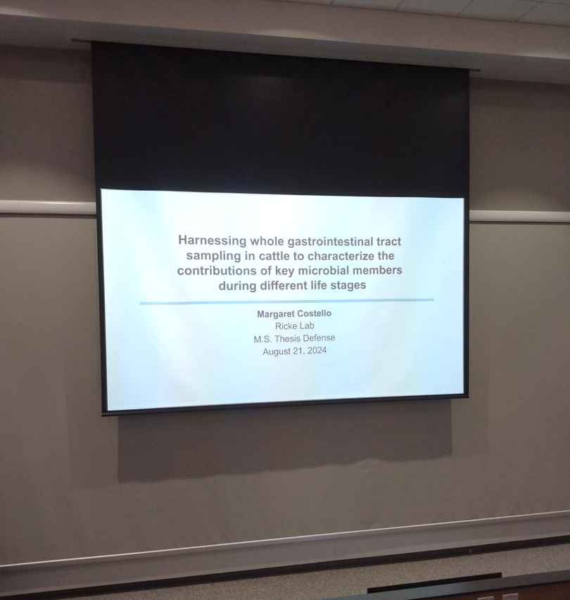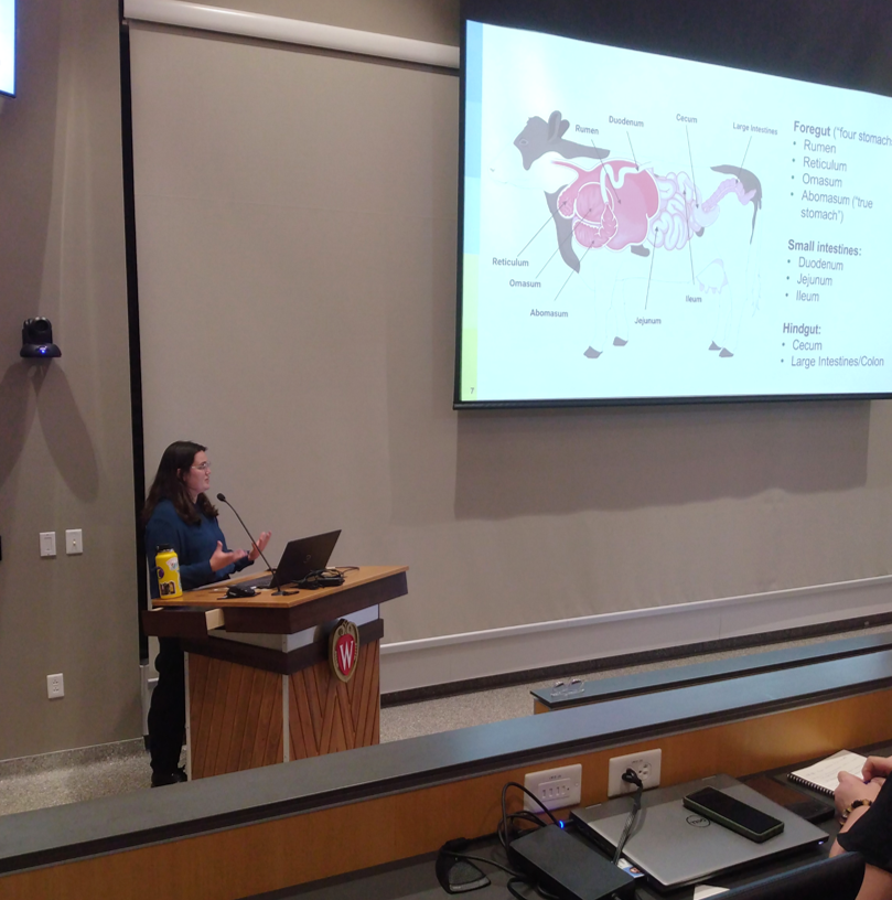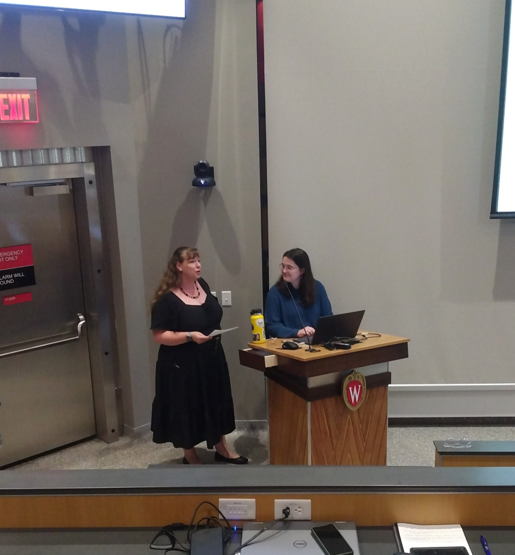Margaret Costello speaks from the podium at her defense seminar presentation.