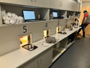 The Sensory Lab is used to conduct product testing studies, bringing in consumers to provide feedback on the sensory qualities of products such as the color and taste. A kitchen area located within our USDA-inspected processing facility allows investigators to provide freshly-prepared foods through passthrough windows to test subjects in a separate room. This preserves both food safety and research integrity. The testing room also offers alternative lighting options, allowing an investigator to remove the psychological impact of the color of the product from the assessment if desired.